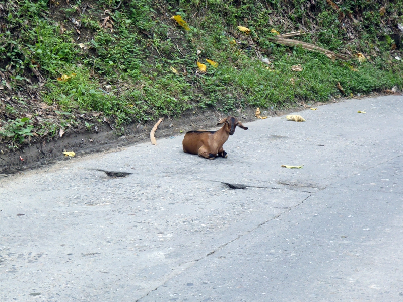 さて、スクーターを借りて出発です。サバンビーチから半島根元のプエルトガレラの中心部を経由して、西にあるホワイトビーチを目指します。恐らく10kmくらい? 一般の人はバイタクに乗って移動するようです。道の真ん中にヤギがしゃがみ込んでいました。家畜? のんびりしています。
