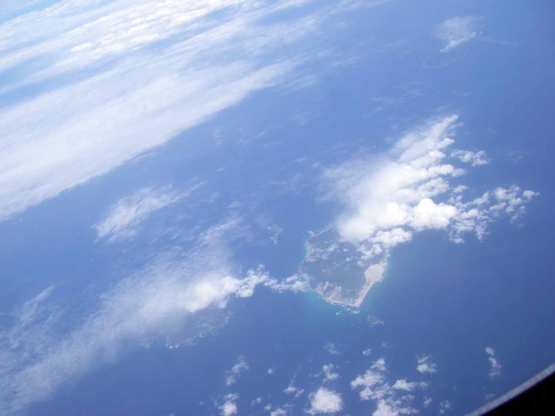 また頼んで窓際の座席を取りました。食事を運ぶトローリーを膝にぶつけられないように。本当に痛い目を見ました。777は割と静か。天候もまぁまぁであまり揺れません。ふと下を見ると大きな島が。沖縄のどの島でしょうか? 周囲は少し青く見えます。