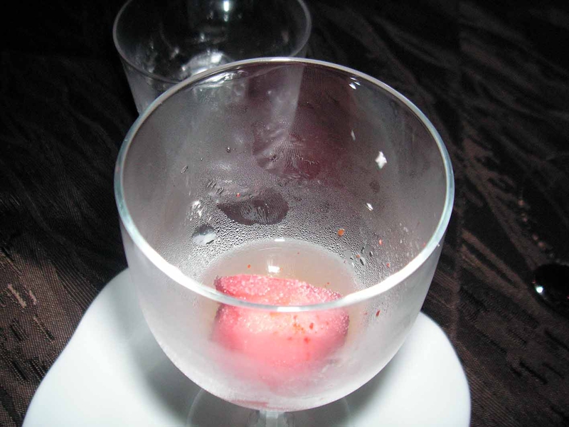 まずはAmuseが数点、これは何やらクランベリーのリキュールにクリームのようなものが入ったもの。一口で入ってしまいます。しかしこのグラスの脚が妙にひん曲がっていてちょっとお洒落。そんな食器を見るのも大きな楽しみの一つ、だいぶお腹が空いてきました。