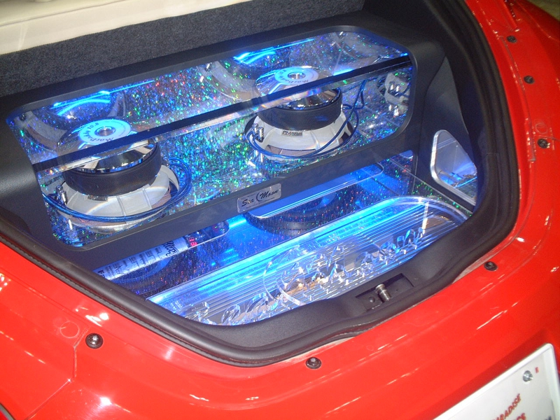 ではでは展示された私の愛車を披露します。残念ながら一番端っこになってしまったため、あまり目立たなかったみたい。ショップの人に私が提案、「後ろのボンネットを開けてエンジンを見せたら人が集まるよ。」やってみたら案の定......。今回のこの車のためのオーディオ機器はメーカー選びから仕上げのデザインまで全てショップに任せました。私の唯一の注文は、「派手にしてね。」