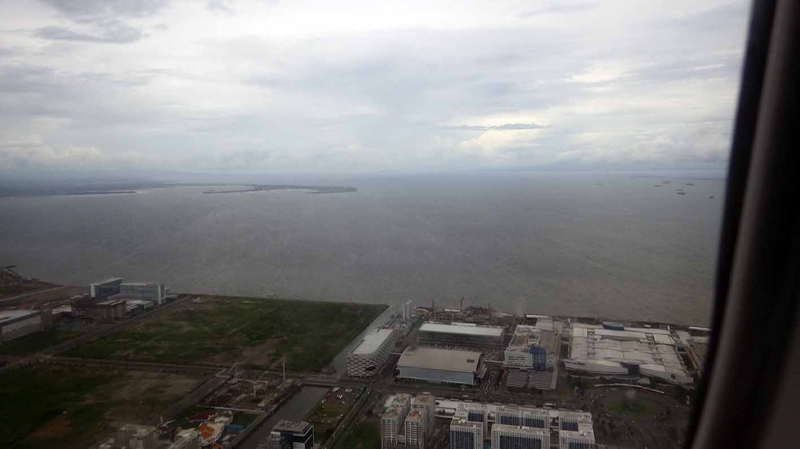 大きく旋回しながら海を目指します。飛行機もバイクも傾けないと曲がらないことを知ってはいますが、「いいよ、無理して傾けなくて!」と言う気分になってきます。マニラの街を上空から眺めながら、一路楽園へと向かいます。とにかくここまでで気疲れしました。この先どうなることやら。