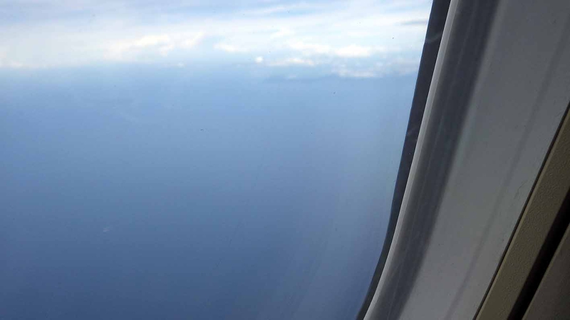 マニラ湾上空、ダイヤモンドホテルは見つけました。しかし隣にある黄色いハイアットは見つからない、昨夜はあの辺をウロウロしていたんだな? どうやら飛行も安定し始め、僕の気持ちも安定飛行に入りました。飛行機はあまり揺れずに、エンジンの音もそれほど苦しそうでなく落ち着きました。