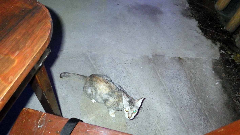 足下には猫が。これもプエルトガレラと一緒、ピザやサラダに入っているハムをずいぶんあげました。3匹ほど来ていました。ピザ、食べきれないので食べてもいいぜ……。ここはHobitと云う店、本当に背の小さなスタッフがたくさんいるCafeでした。ちょっと侘しい夕食でした。