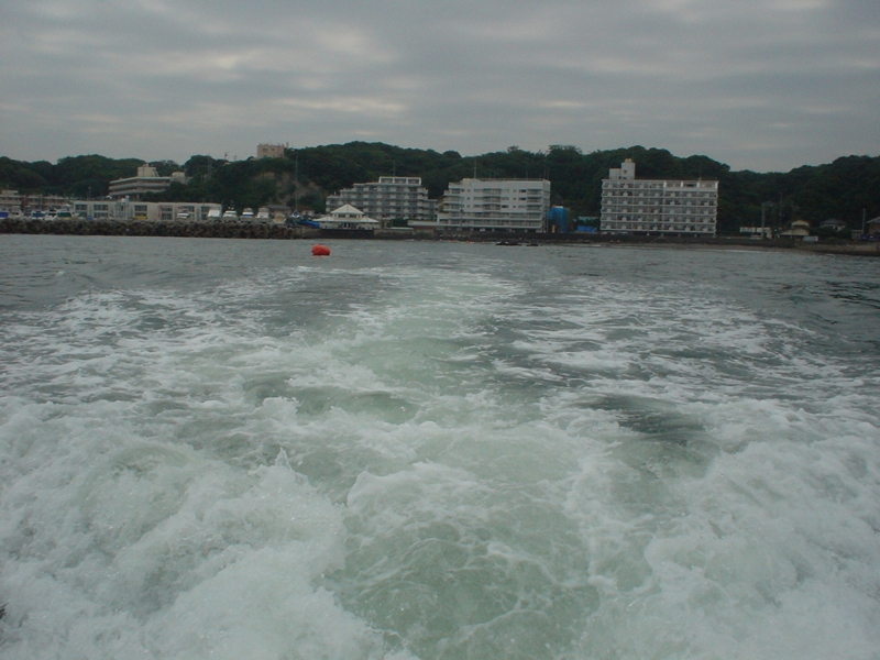 出航! 心地よいエンジンの音とともにみるみる岸壁が遠ざかっていきます。今回の乗員は私も含めて7名、最高に良い気分です。やはりこんな場面に遭遇するとクルーザーが欲しくなります。