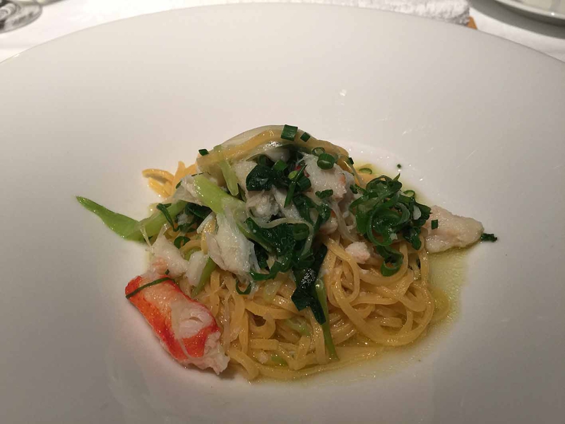 個室を取りましたがちょっと狭そう、今回のメンバーは9名、ちょっとキツキツです。シャンパンから始まって左の前菜、次に本ズワイガニのタリオリーニが来ました。パスタの茹で加減はさすが、イタリアへ行った時もパスタの硬さには大きなこだわりがあるようでした。ズワイガニは北海道産です。