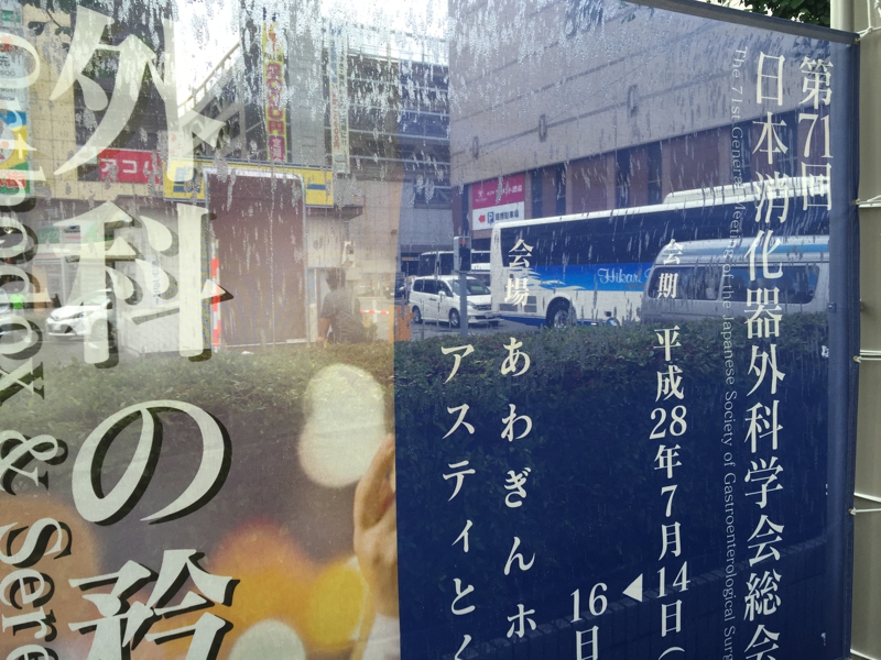 30分ほどで徳島駅に到着、バスの窓にも日本消化器外科学会総会のステッカーが貼ってありました。恐らくそれほど大きな街ではないはず、市内のホテルは全て満室ではないでしょうか? いつぞや循環器病学会で横浜市内のホテルですら全て満室になるぐらいですから。この小さな街では学会の経済効果はかなり大きいのではないでしょうか?