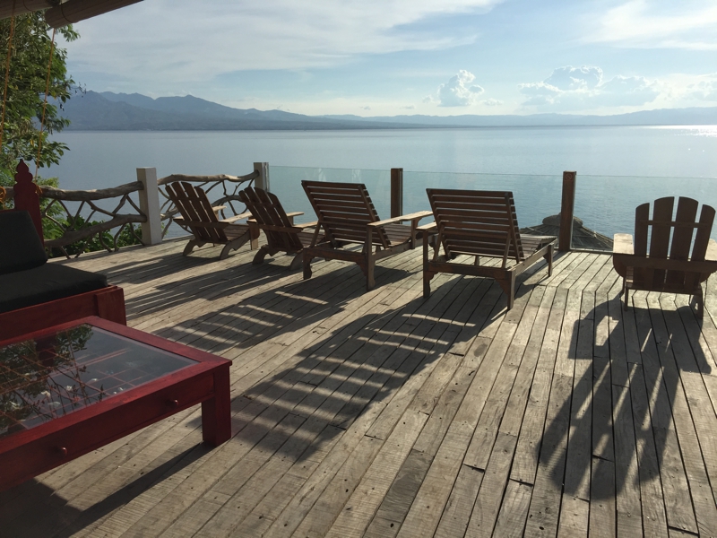 そしてダイニングを横目にベランダまで進んで行くと……、うわ〜!! 最高の景色です。このロッジが崖の上にあることが分かります。ラグーンの海ではないけれど、青々とした澄んだ海が広がります。向こう側には別の島、そう、ネグロス島が見えます。頑張れば泳いでも行けそうな距離に感じます。