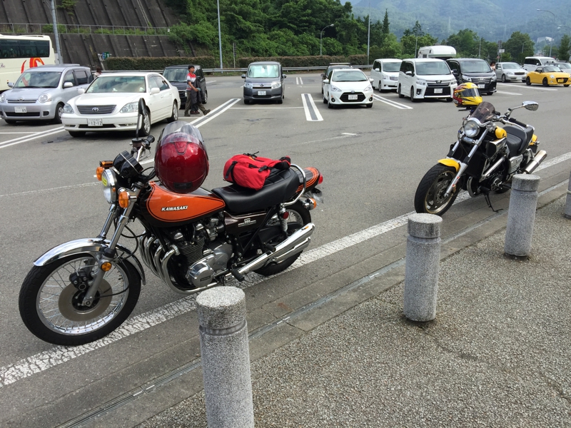 心配していたETCも無事に稼働し、スムーズに高速に入れました。家を出て30分、集合場所のPAに到着、車と違ってやはり休憩を多く取り入れて道中進みます。途中でT君から提案、「バイクを交換しようよ。」OKして彼のヤマハV-Maxに跨がりました。排気量は僕のバイクの1.3倍、パワーは3倍? 楽〜♪ 後ろを気にせず飛ばした後、バックミラーを見ると彼の姿はなし……?