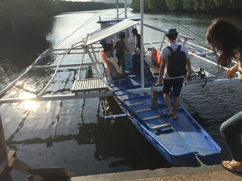 これまた頼りなさそうな小さなバンカーボート、でもエルニドのミニロック島に渡った時のような荒れた天候ではないので、あまり心配する事はありません。取り敢えずここは少し入江に入った川のようなところ、数組のゲストを乗せて舟はすぐに出発、重い荷物はスタッフが運んでくれます。