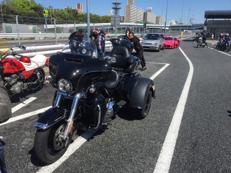 続々と仲間が集まってきました。ハーレーのトライクが2台も。実は後で判った事ですが、このハーレーのトライクがフル加速するとZ1では全く追いつかないのです。ビックリ! ちょっと跨がらせてもらいましたが、なかなか楽しそう。最近ではハーレーのファクトリーモデルのトライクが出てきましたが、500万円以上するのです。手も出ないし、それにせっかく大型二輪の免許取ったのに。