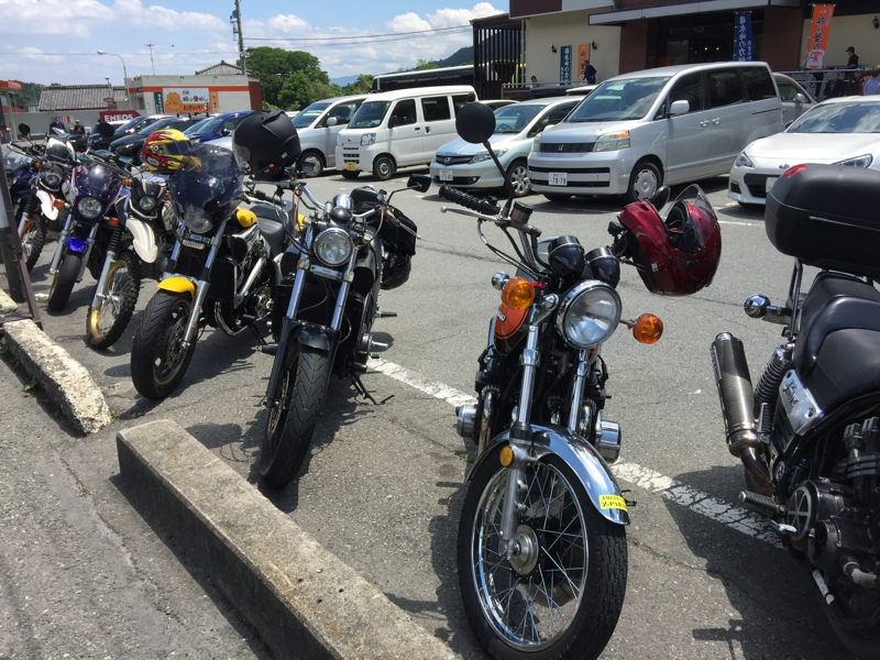 総勢でこれくらい? 30-40台いるでしょうか? タンデムの人もいるので、人数はもっと多くなります。さすがに皆んな疲れているよう、僕らよりもだいぶ早く東京を出て、僕ら程休憩を取らないでここまで来ているはずです。やはり僕は直線をぶっ飛ばすのが好き、峠道を右に左に行ったり、時に信号待ちで突っ立っているのはどうも苦手です。さぁ! そろそろお昼ご飯、行くよ!