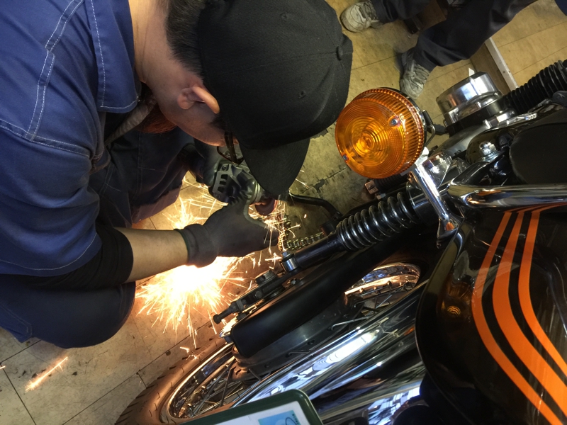 バイク屋のJ君と。やはり古いバイク故で先で何が起こるか判らないところ、こんなプロフェッショナルがいると安心出来ます。前回の車検は彼に頼みました。バイクを倒してウィンカーを潰してしまった時も。もともと動かなくなってしまったZ1をトラックで家まで取りに来てもらって修理をしてもらったのが付き合いの始まり。そして今日、これから彼の出番があるのです。