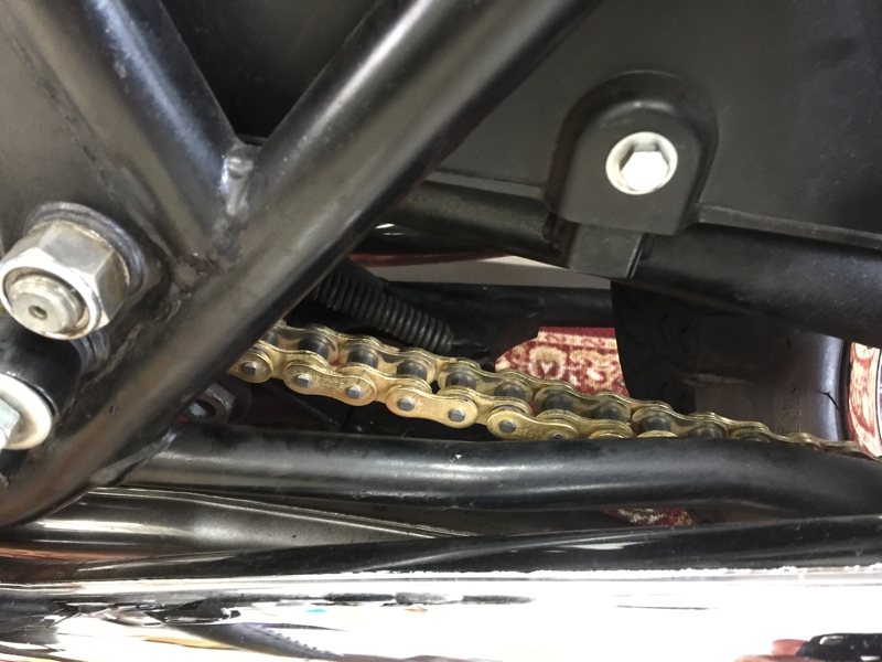 そのチェーン交換に際してちょっと我が儘を言ってしまいました。ゴールドのチェーンが良いなぁ……、その希望を叶えてもらいました。なかなかこの旧車用のチェーンを入手するのは困難なようです。太さがだいぶ違うらしい……、でも 先生、今回はちょっと良い奴を入れておいたよ 頼もしい言葉でした。どうやらこれから夏本番、我が愛車の出番はしばらくないかも……。