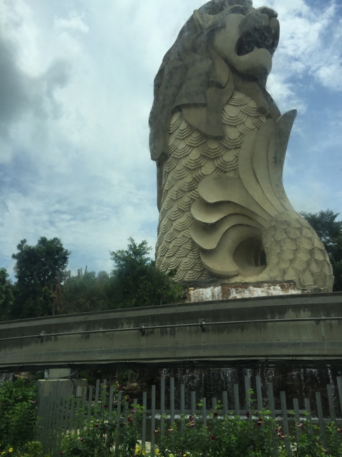 途中、バスの中からマーライオン像が見えました。元々のマーライオン像はベイエリアにあるもっと小さなもの、口から水を吐き出しているチンケな像ですが、こちらはかなり巨大、どうやら中に入る事が出来て、更に上の方には展望台もあるようです。こちらへは明日また向かう予定、取り敢えずは胴体の部分だけ写真に納める事が出来ました。バスはまた20分ほどでホテルの入口まで。