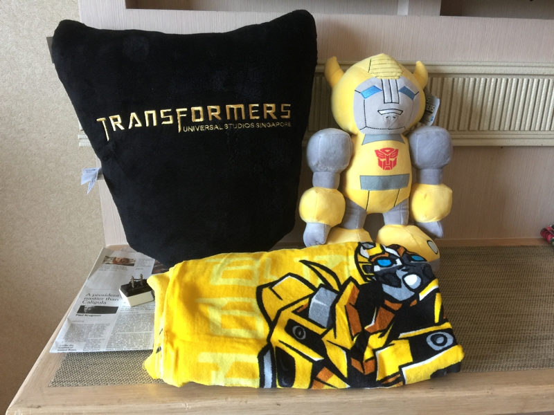 ホテルの自室に戻って来ました。ユニバーサルスタジオのトランスフォーマーのお店で買って来たのはこの3点、黄色のシボレー・カマロが変身するバンブルビーの人形、トランスフォーマーの黒いクッション、そしてバンブルビーの黄色いバスタオル、いずれも車の中に置くつもりです。これらを手に入れたくてユニバーサルスタジオに行きました。飲み物を飲んだ以外は全くの素通りでした。これで満足!