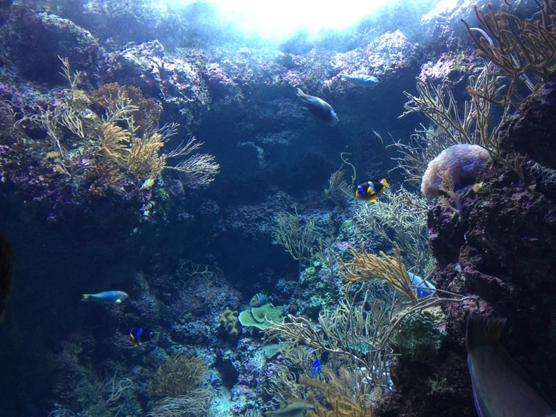 暫し廻りの客と同様、床上に座ってこの水槽を眺めていました、なかなかの迫力、海の中にいるような感覚に陥ります。長さ30m以上に渡って広がる大水槽、その手前は雛壇になっていて、みんあ堂々と座り込んでみています。それに紛れ込んで床に座っていても大丈夫そう、中にはサメ、マンタ、でかいハタなどがいて、更に小魚もたくさん泳いでいます。食べられちゃったりしないのだろうか?