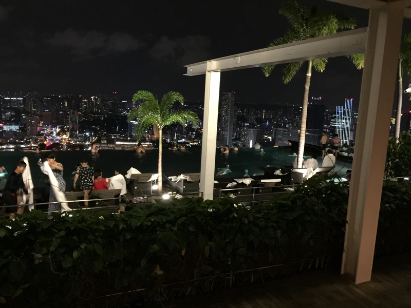2杯飲んで少し良い気分になって出て行く事にしました。ラフロイグ2杯、簡単なおつまみをもらってチャージ含めて1万円弱? まぁこのロケーションではこんなものでしょうか? ちょっと部屋の外に出るとこんな景色、この辺でじっくり飲めると更に気分は盛り上がるのでしょうけれど。プールは午後11時にClose、しかしバーはだいぶ遅くまでやっているようです。シンガポール最後の夜……。