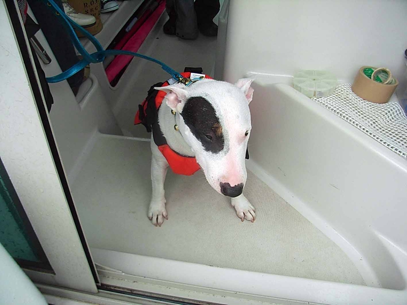 さぁ、乗船! 雨が結構な勢いなのでデッキにはいられない、愛犬も室内に。何が始まるのか全く判らない様子。でもクルージングを経験出来る犬なんて滅多にいないぜ。