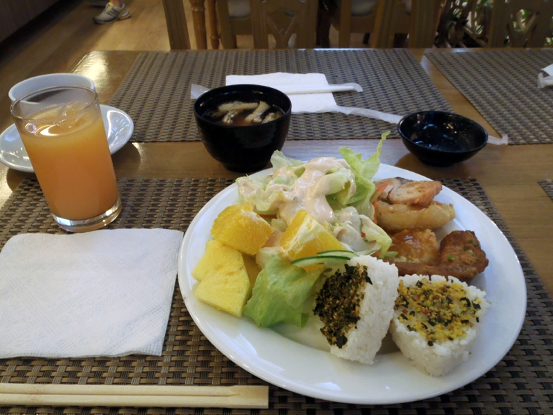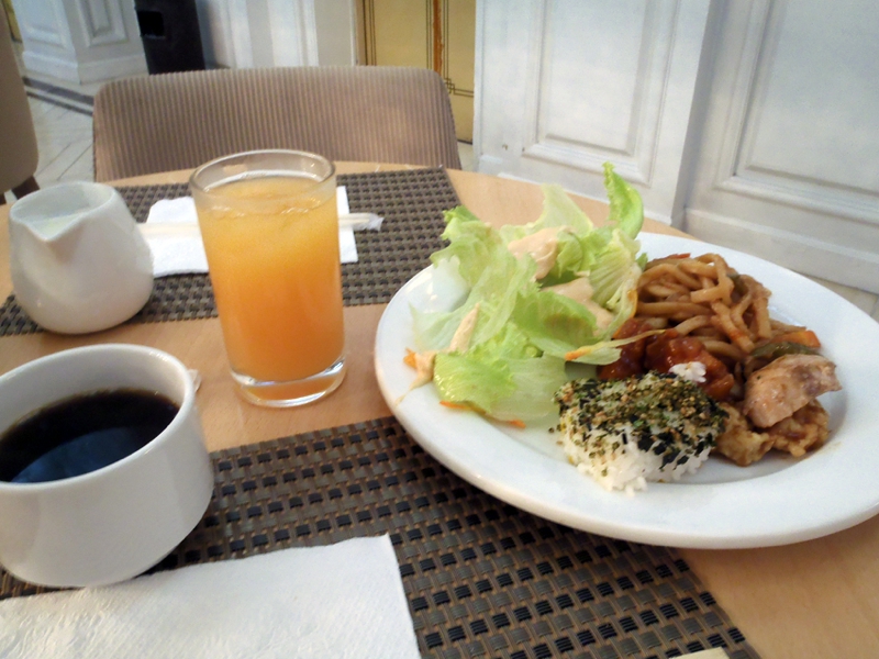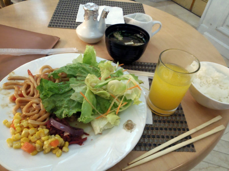 朝の7時半、朝食に行きました。ビュッフェ形式ですが、ハイアットやマンダリンに比べればその内容はちょっと寂しい。しかし日本人向けのおにぎりやみそ汁もあります。そして今朝は焼うどんがありました。また例によって朝のサラダはたっぷり、そして美味しいお米がありました。