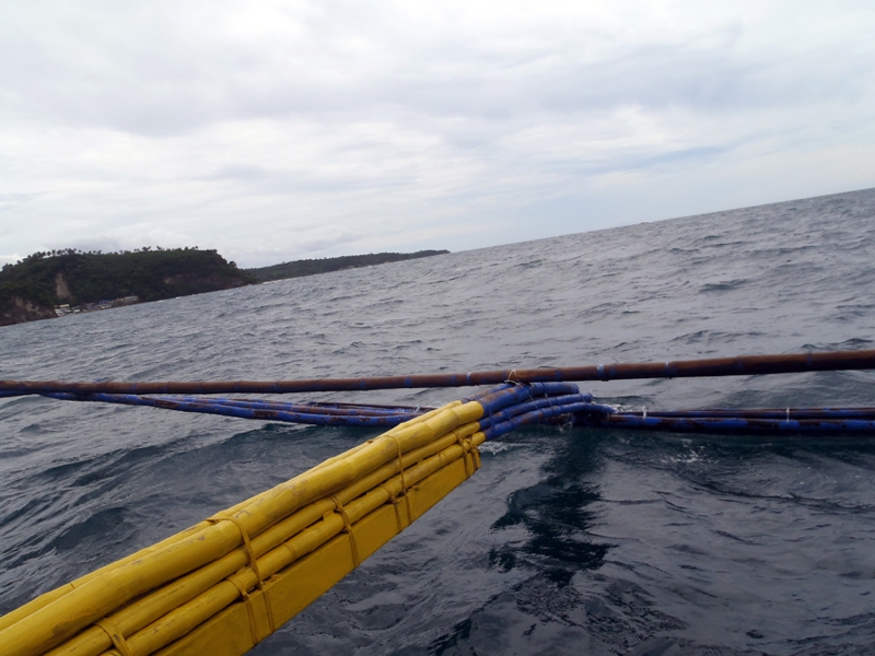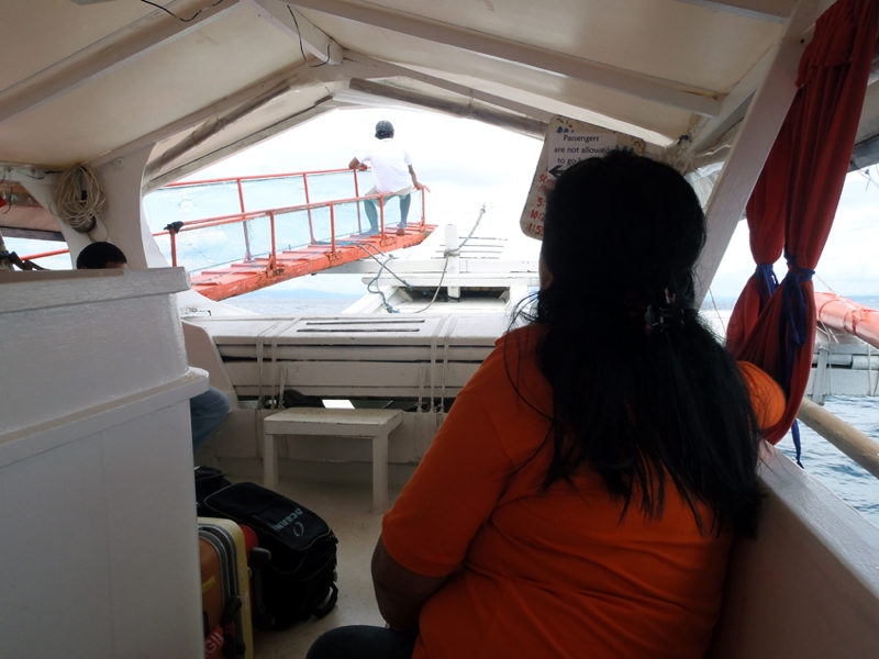 僕の前に座っているフィリピン人のおばちゃん、もうちゃっかりライフベストを着込んでいます。そう、島の沿岸を走っているので万が一船がひっくり返っても何とか陸までは泳いで行けそう、少なくとも溺れ死ぬ恐怖は感じませんでしたが、何時自分に吐き気が襲って来るか? それは不安でした。