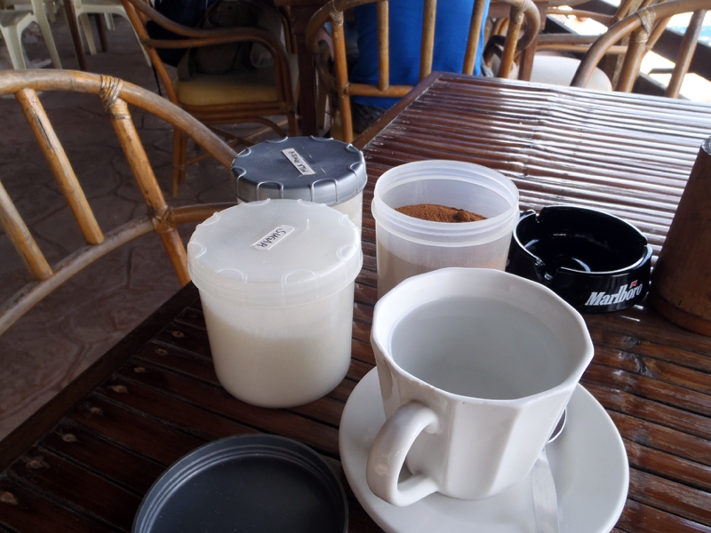 コーヒーはドリップやサイフォンではなく、インスタント? カップに熱いお湯が入っていて、自分でインスタントコーヒーの粉、砂糖、そして粉のクリームを入れるようになっています。でもインスタントにしてはまぁまぁの味、何よりもここからの景色が今日一日の素晴らしい始まりを予感させます。
