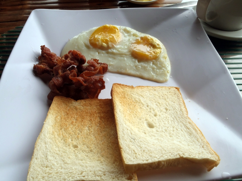 海の目の前のカフェに座り込みました。他に客は西欧人のおじいさん一人、恐らく退役軍人なのか? 僕と目が合うと軽く挨拶、気持ちのよいロケーションです。朝食メニューはアメリカン・ブレックファスト、フィリピーノ・ブレックファスト等4種類ほど、アメリカンを選びました。