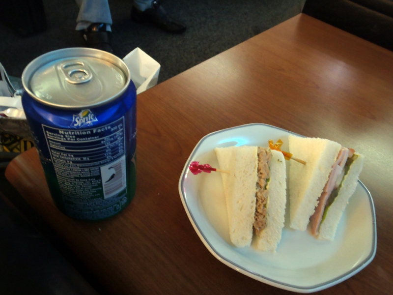 何となくムシャクシャしながら、またサンドイッチとコーラをもらいました。疲れて眠気も。やがて搭乗の時刻を迎え、最後にもう一度セキュリティチェックを受け、待ち合いロビーにたどり着きました。もうヘトヘト、こんな状態でジャケットや眼鏡を忘れるんだよな? 今日は充分に気をつけています。今までいろいろなものをなくしました。