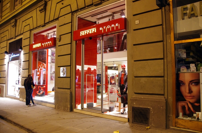 さっき通ってきた場所ですが、フェラーリ・ショップを見つけました。かなり大きな店、もちろんこの時刻では閉店ですが、また明日にでも来てみよう。マネキンがあり、フェラーリウェアが格好良いです。フェラーリのベルトで一目惚れしたものがありました。