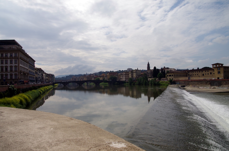 何気に歩いていると川にぶつかりました。アルノ川? と云うことは有名なベッキオ橋に行けるかな? 結構な水流が音を立てて流れます。川の水はそれほどきれいではない、しかし向こう岸の建物が如何にも中世ヨーロッパ風、良い景色です。下流は何もなさそう、では上流に向かいますか? 少し曇ってきてしまったけれど、空気がきれい、僕は今イタリアにいます。