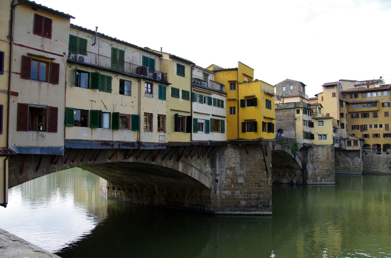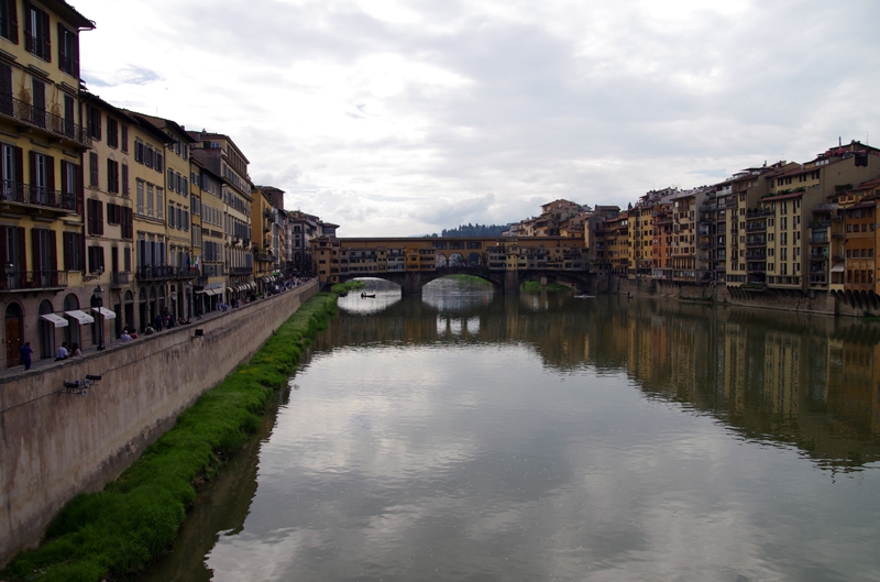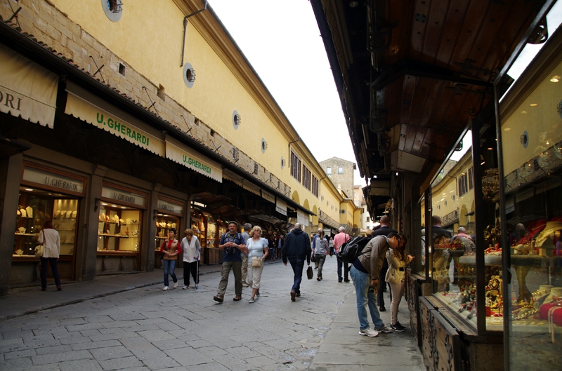 ここはフィレンツェでも有名な観光スポット、橋の両側にジュエリーショップが多数並び、人も多く集まる場所です。テレビでも楽しげなスポットとして観たことがありました。まぁ、今日この場でジュエリーを買っていこうとは思いませんが、目の保養にはなるだろうと楽しみにしていました。