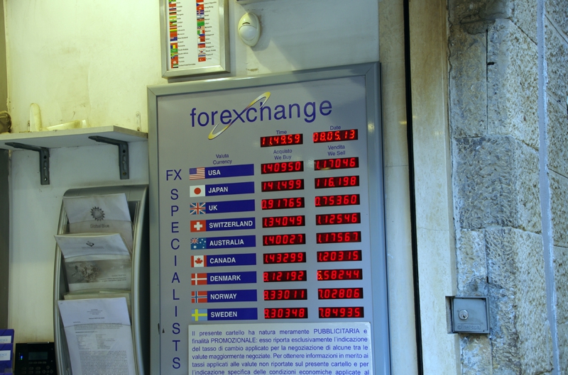 さて、ベッキオ橋を離れ、また中心街へ向かって歩きます。バンコクやマニラのようにあちらこちらに両替所がある訳ではありませんが、さすがジュエリー街のすぐそば、1軒ありました。取りあえず大きな買い物をするときにはクレジットカードを使いますから、あまりユーロのキャッシュは要らない、覗いてみましたが交換レートは悪い!