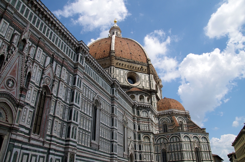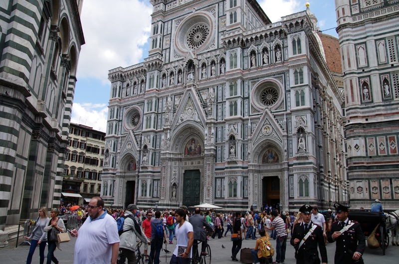 この建物だけは一目見て判ります。ドォーモと書いてある本とドゥオーモと書いてある本がありました。やはりフィレンツェでNo.1の建物? 独特の偉容、荘厳さを醸し出します。周囲をグルッと回ってみました。工事で近寄れないところもあり、1周するのも結構大変でした。
