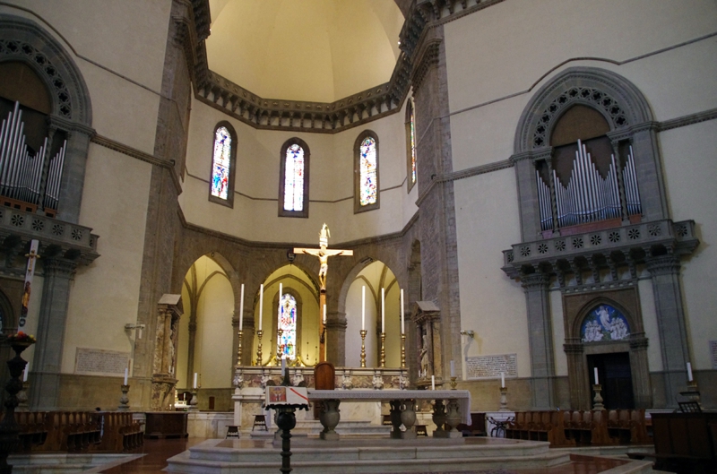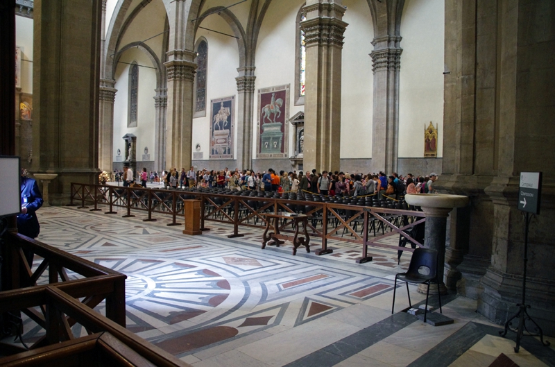 ドームの真下、下から見上げます。初期ルネッサンス建築の代表、ドームの内側には装飾の絵がビッシリ、描いた絵を持ち上げたのだろうか? もしかして逆さに宙づりになって絵を描いたのだろうか? そんなことを考えました。中は何となくヒンヤリ、歴史の重みに自分自身が潰されるような、そんな感覚に陥ります。