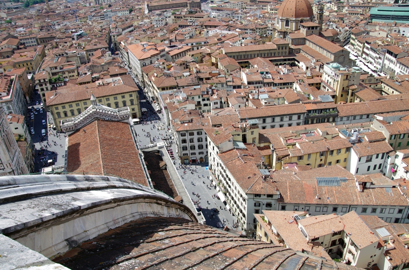 真下にはかなりの人がいます。ドームの丸い部分は下に行くほど角度が急になっています。滑り台のように滑っていったら真っ逆さまに下まで行くんだろうな? でもこの素晴らしい景色に見とれ、高所恐怖症の病は一休みしてくれているようです。涼しい風が少し吹いていました。