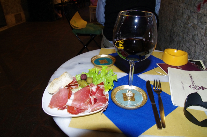 正直なところ、ワインはあまり得意ではない僕にはちょっときつめ、無理して2杯飲みましたが、結構な勢いで身体に染みこんできました。生ハムは歯ごたえがあってこくも充分、日本でもっと小さいピースで食べる生ハムに比べて食べ応えのあるものでした。少しパンももらいました。