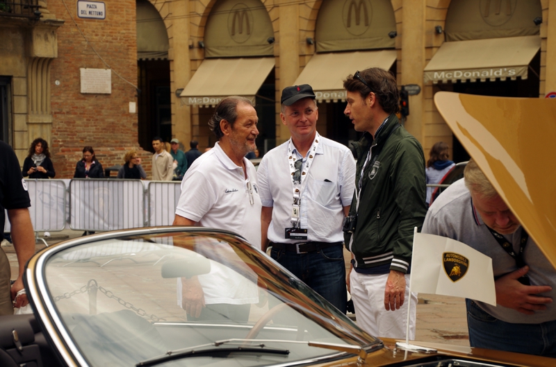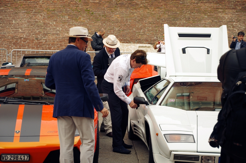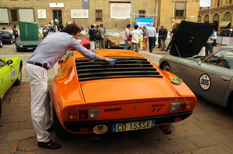 愛車ミウラのリア・バイザーを丁寧に拭くオーナー? 気持ちはよく分かりますよ、我が子を可愛がるよう、本当にこの車は格好いいです。でもこの車が生まれたのは1960年代、こうして現役で走っていられるのはオーナーの熱烈な愛情の賜物でしょう。表彰されると良いですね?