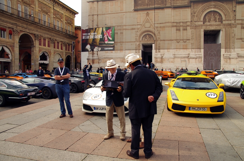 今回集まった車の中でコンクールド・エレガンス、つまり車種別に良い車を表彰するイベントが同時進行しています。紺色のブレザーにベージュの帽子を被っているスタッフがその審査員、年配の人ばかり、ランボルギーニ本社の重役達でしょうか? でも参加車は目一杯きれいに、お洒落しています。