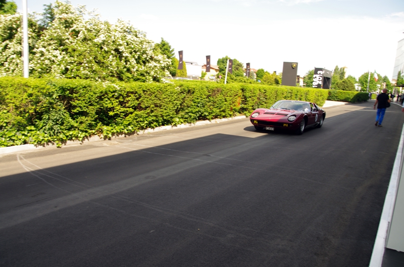 興奮冷めやらぬまま社屋から出てきました。これほど濃厚なパック・ツアーはないのではないか? ランボルギーニの紙袋に買い物を目一杯詰め込んで外へ、すると正式なツアー参加者の車達が正に本社へ着くところでした。赤いミウラ、生まれ故郷に帰ってきた老人のよう、きっと車も喜んでいるのではないでしょうか?