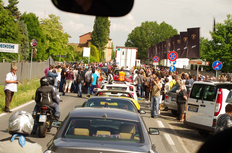 バスが出てしばらくしてから、マヨール広場に並んだランボルギーニ達はこのコースを通ってランボルギーニ本社へ、そして本社内で行われるパーティに参加します。残念ながら僕ら外野組はそのパーティに参加出来ません。その代わりに工場見学が出来ればと願って向かう訳ですが。