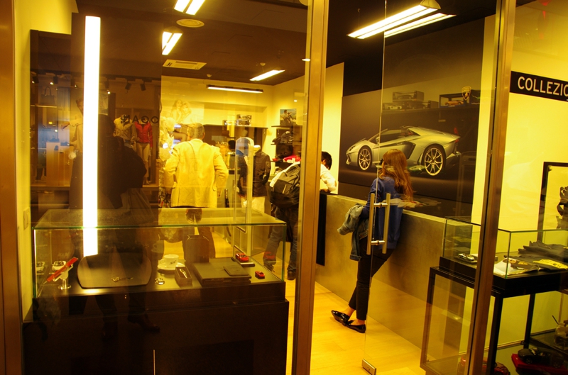日本人の団体客がドッと押し寄せて、相当な売り上げがあったのでしょうね? 何と店の中で大瓶のシャンパンとサラミやソーセージのおつまみが振る舞われました。大サービスです。スタッフも相当な売り上げにちょっと満足げな顔。店の外にはシルバーのアベンタドールの実車が展示されていました。さぁ、そろそろバスの出発時刻ですよ。