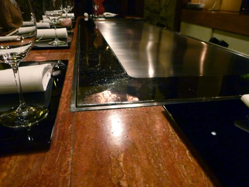 良い音を出しながら焼かれて行きます。正直なところ、このステーキ2枚をナイフとフォークを使って一人でも食べられそう。だいたい一人120g見当、塩や胡椒が丁寧に振りかけられます。これまたまるでショーのよう。そして如何にも切れ味の良い大きなナイフでサイコロ状に切られて行きます。まずはディアムレアの人から供されます。
