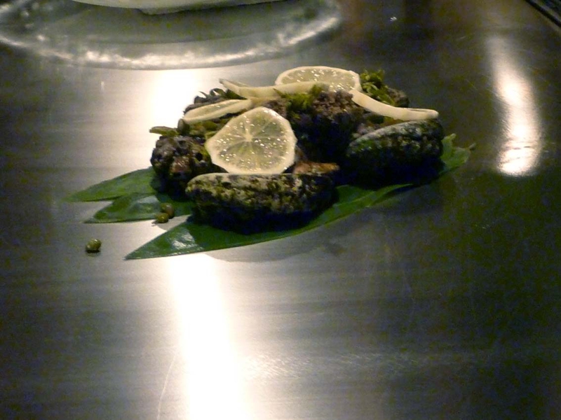 昆布は北海道産だそうです。鮑も昆布を食べるそうな。ウニだけではないのですね? 自分が食べる食べ物の上に敷かれて焼かれるなんてちょっと皮肉? レモンを乗せて熱くなってくると、可哀想に鮑は苦しそうにもがいて動き出します。結局一番残酷なのは人間なのか?「今日の素材です」なんて晒し者にされる生きたままの魚の気持ちは?