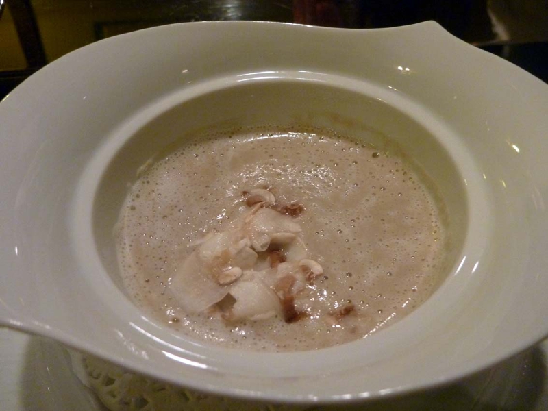 そんな鮑が料理されている間にスープが運ばれて来ました。キノコのポタージュスープ、割とさっぱり目の味付けでした。これも何となく量が足りないような。もう少し大きなボウルに入れてくれても良さそうなものですが、少し足りないくらいに押さえ込んでジラすのが相手方の手段でしょうか? スプーンで5-6回すくうともう終わり。