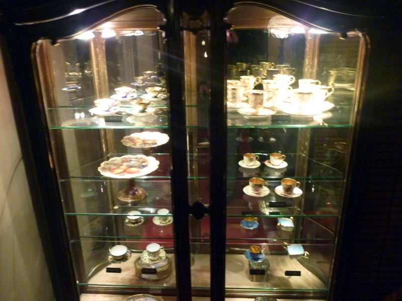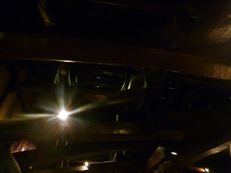 食事も終わり今度はデザート・タイム、あるスタッフにとってはこれからが本番? 席を2階のデザートコーナーに移します。これはそこの天井を移した写真。ここは旧家を移設して出来上がった建物、木の梁がむき出しですが良い雰囲気を醸し出しています。デザートメニューが出され、ああでもない、こうでもないの大論争が始まります。