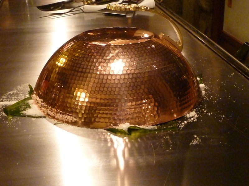 さて今度は本日のセミ・ファイナリスト、鮑の塩釜蒸しです。これまたこの店の名物料理。人数分用意されて来ました。いつぞやは貝が食べられないと言う某スタッフも、今や僕の方針に洗脳されて、今は食べられるようになりました。そう、食わず嫌いなんて人生だいぶ損する結果になるよ。さて鉄板も暖まり、いよいよ料理の始まりです。