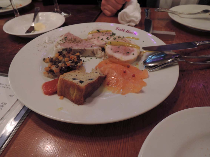 更に前菜の盛り合わせ、スモークサーモン、キッシュ、ローストポーク、合鴨のパテ、レンズ豆。ちょっと前菜取り過ぎたかな? その間にもワインはドンドン進みます。肉料理が来ないうちに赤ワインはもう空いちゃったね? パンが結構な勢いでなくなっていくのが気になりました。払う側としてその方が安上がりで助かるんだけれど…….。