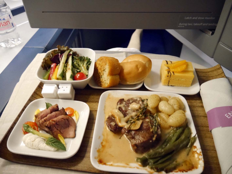 水平飛行になってすぐに機内食が出されました。JALのように和食や洋食から好みをセレクトすることは出来ませんがなかなか豪勢、フィリピンではステーキは恐らく食べられないだろうからちょうど良いかも。さすがにフルフラットは楽ちん、いつの間にか深い眠りについたようです。目覚めたらマニラ、の予定だったのですが……。