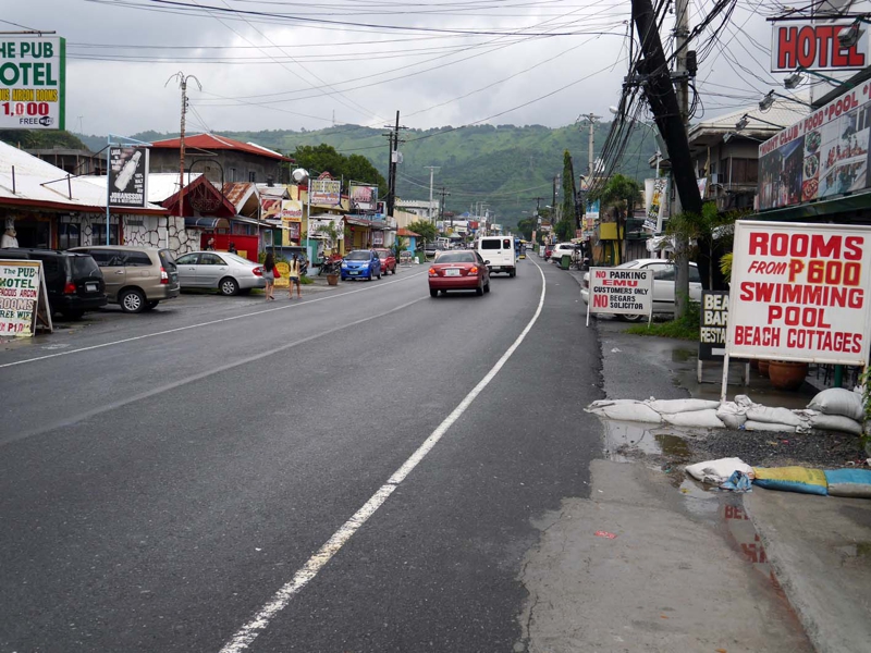 今度は徒歩でホテルを出た右側に向かって行きます。雨はしばし止みました。取りあえず傘は要らないくらい。しばらく歩くとお店が連なっています。こっちの方が栄えていそうだな? ホテル、レストラン、小売店、バーなどが軒を連ねます。まぁ、聞いていたほど寂れているわけではない、湘南の海岸通りくらいの感じ、でも何となくフィリピンの田舎に来たと云うワクワク感は感じられました。