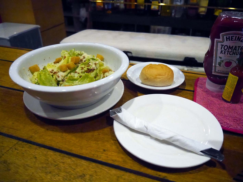 美味しくなかったビーフンが胃の中に残っているのか? あまり重い食事は要らなそう、まずシーザースサラダを頼みました。得てして旅行ではついつい野菜が不足してしまうもの、意識して野菜を取るようにしています。フィリピンはフルーツも豊富です。なかなかのボリュームのサラダ、ドレッシングも美味しかったです。サラダにはパンも付きます。さてメインディッシュ、何を食べようか?