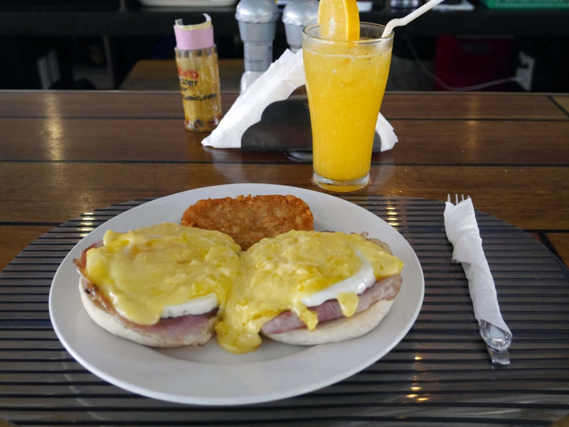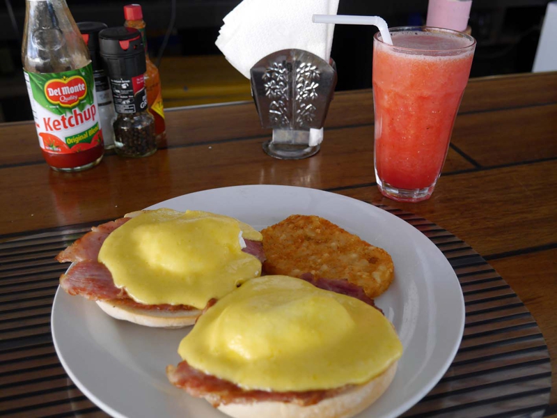 この店のメニューは全部ではないけれど一部写真付き、この料理がすごく美味しそうに見えました。エッグ・ベネディクト、マフィンに焼いたハム、そして卵と何かを混ぜたものをマヨネーズで味付けしてかけます。ナイフとフォークで食べるのですが、これが何とも旨い!! 病みつきになりそうな味でした。それにマンゴージュースとコーヒーが僕の朝食です。後ろはプール、良い雰囲気です。